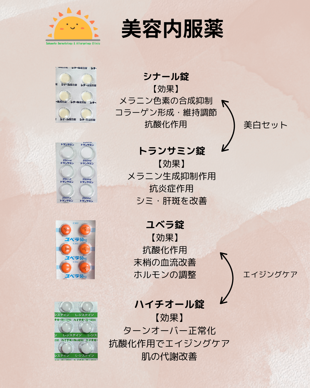 - ・ビタミンC錠、トラネキサム酸錠 、ユベラ錠、ハイチオール錠