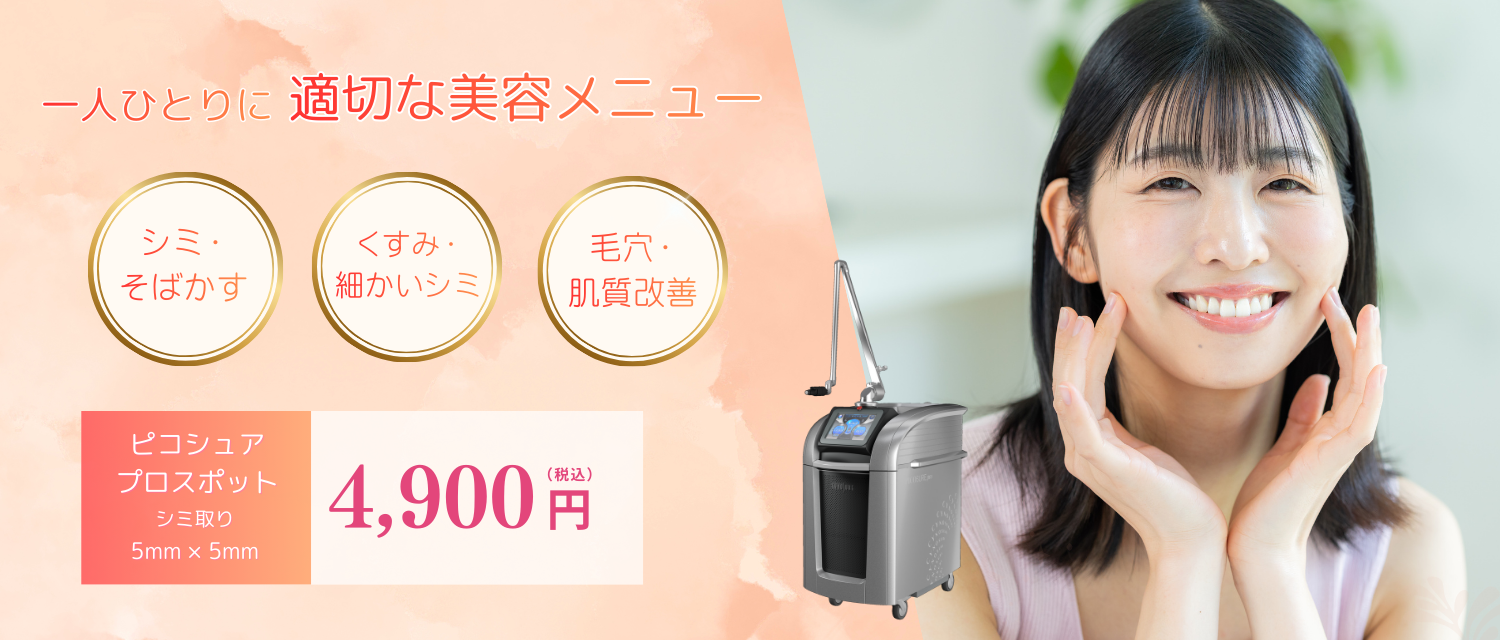 シミ・そばかす・ADM・太田母斑など、気になる色素だけをピンポイントに除去する治療です。 ピコシュア®プロは、熱に頼らず衝撃波で色素を細かく砕くため、肌への負担が少なく、炎症後色素沈着のリスクも抑えられます。